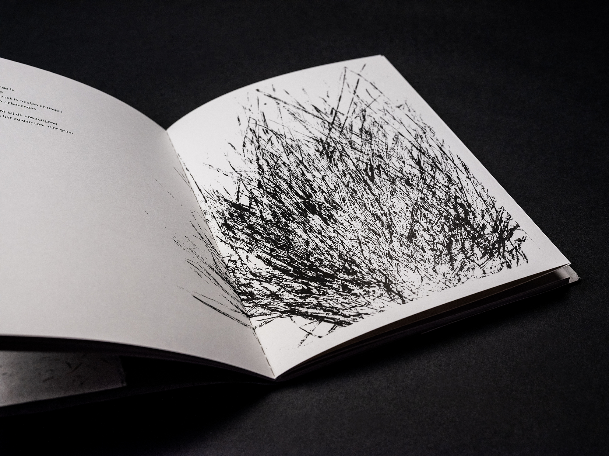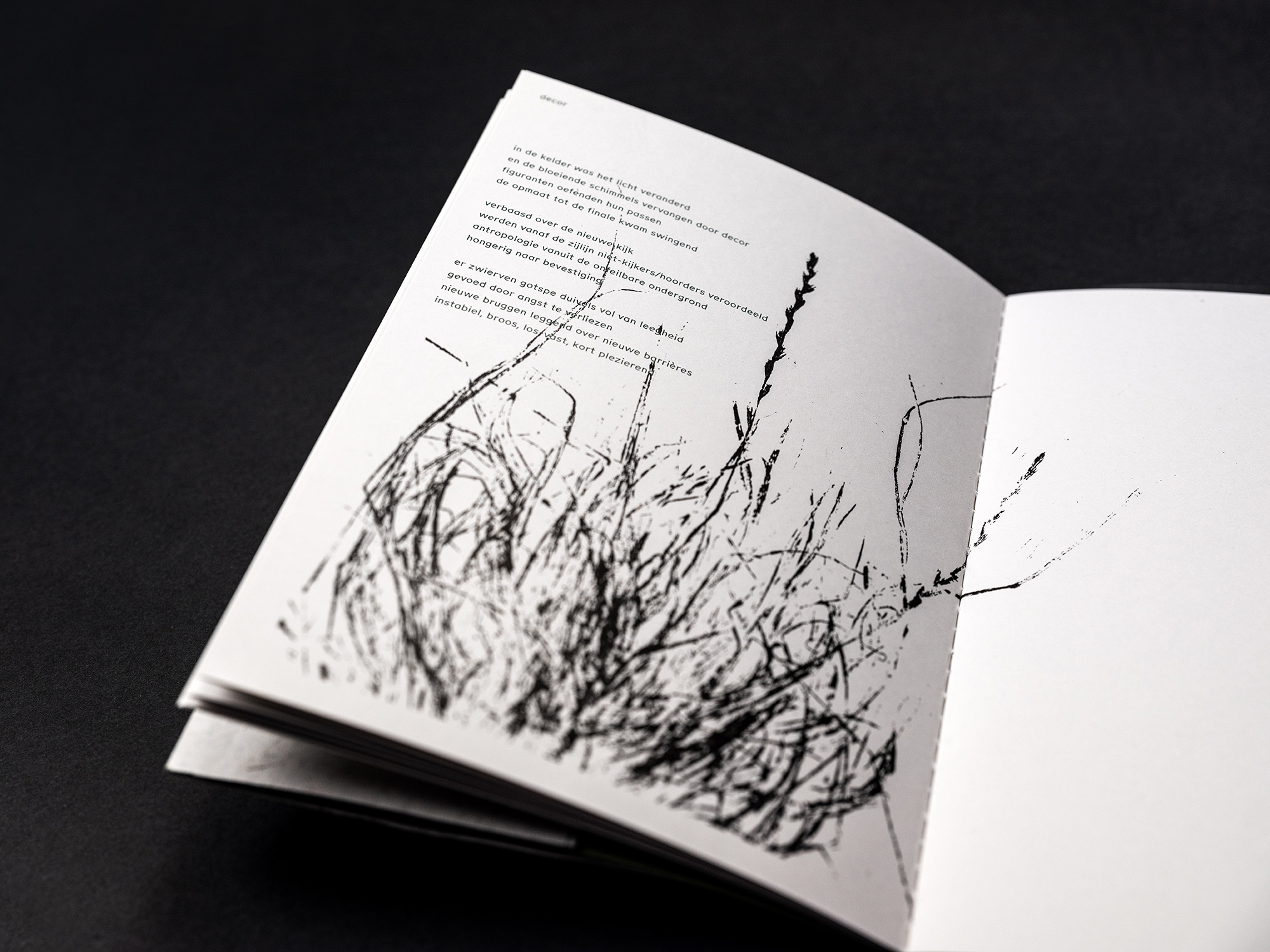 “Ik vond de eerste bladzijden, toen ik ze na een te lange sociale media-sessie bekeek, een verademing. Mooi, bijna leeg papier met de zwarte afdruk van een paar grassprieten, een spoor van een stuk natuur dat zo alomtegenwoordig is dat we er normaal gesproken weinig aandacht voor hebben.”