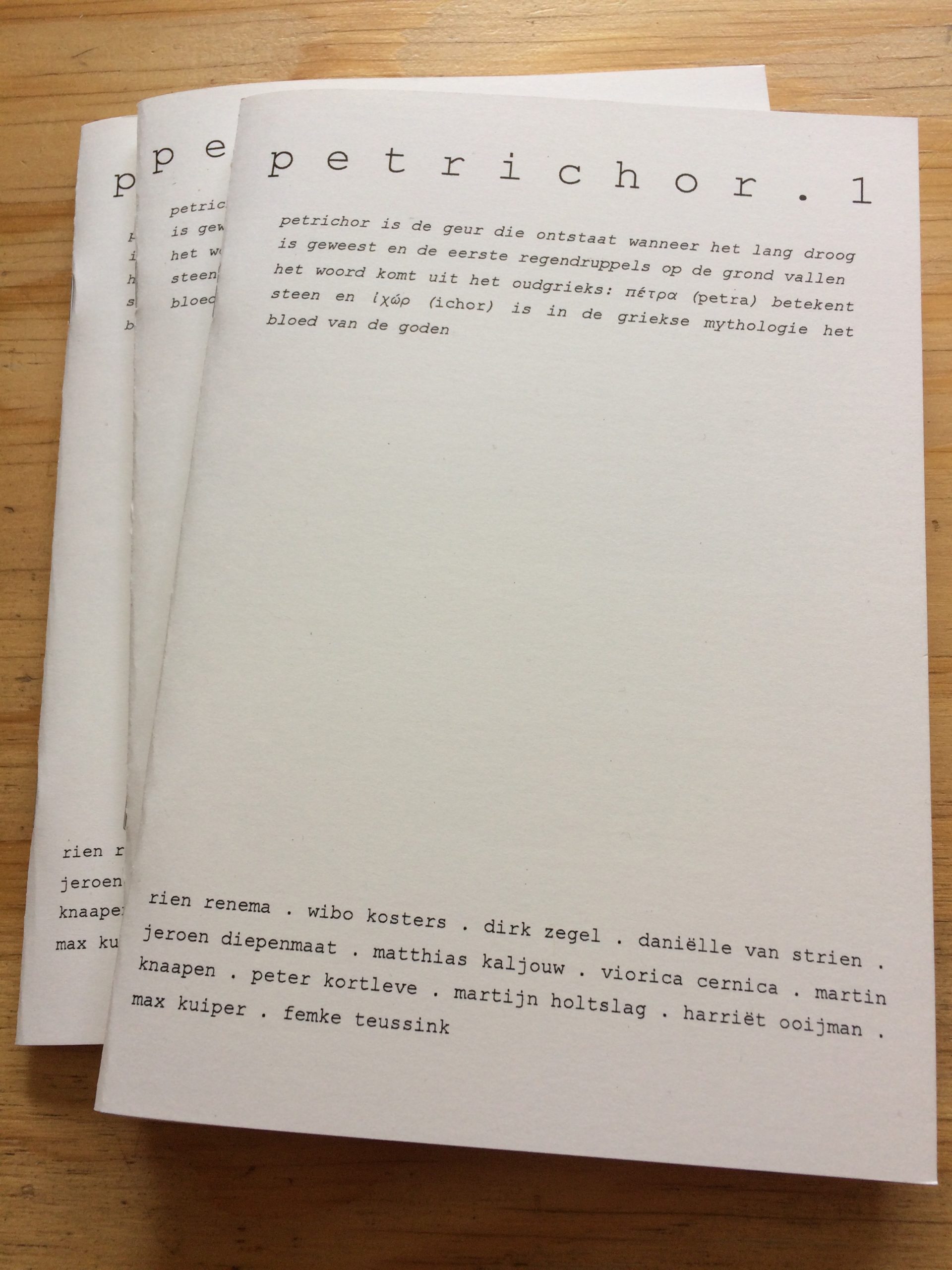 Stichting uitgeverij petrichor* is een kleinschalige underground uitgeverij van poëzie, beeldende kunst en andere fraaie zaken die zich in een boek zo mooi kunnen presenteren.